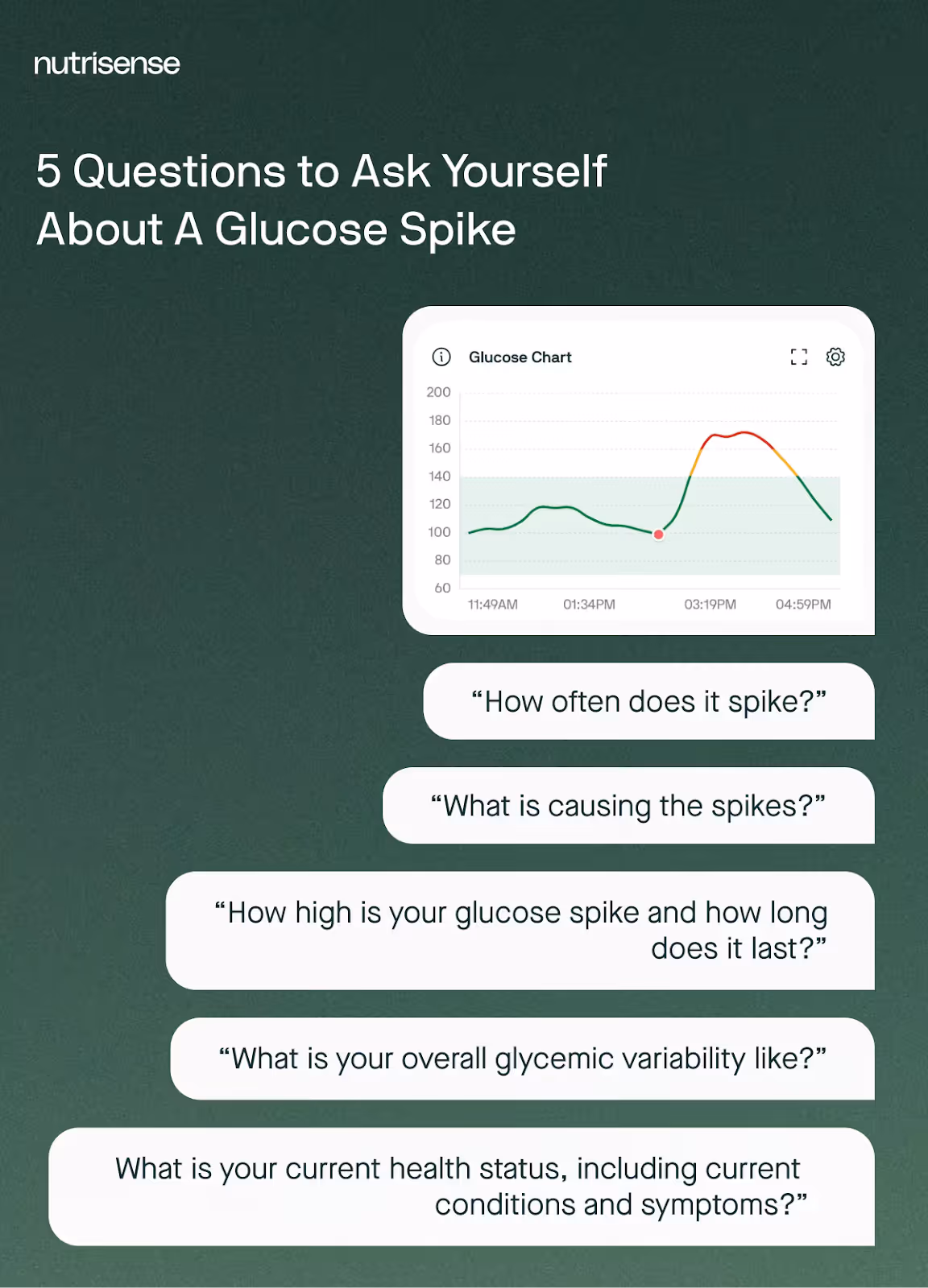 Not every single glucose spike above 140 mg/dL may be a cause for alarm, depending on the context. To understand whether or not a glucose spike is really concerning and what you might do about it, you’ll want to consider the following five questions.
