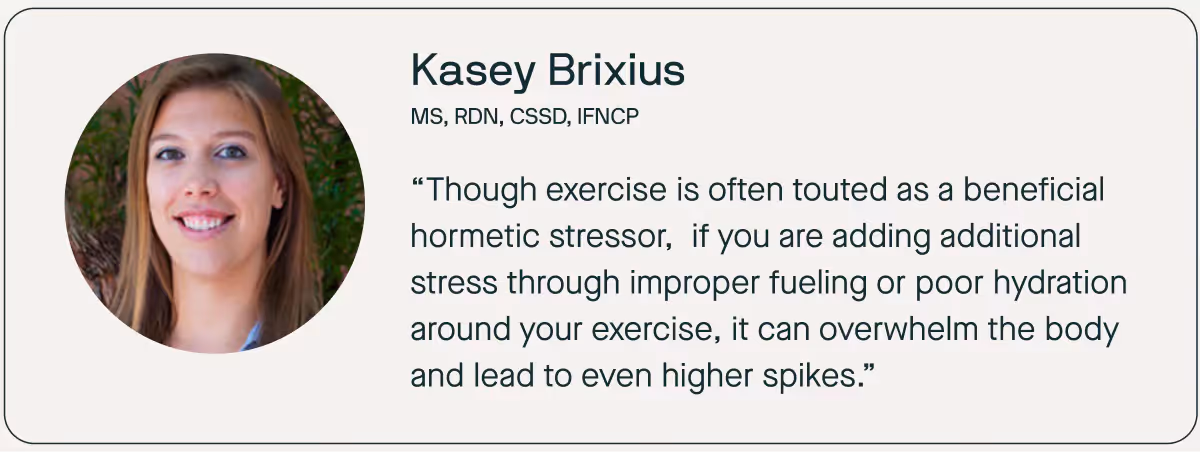 “The mechanism for why the body is dumping out the extra glucose is related to a stress response, and it’s the same as what happens when we are stressed from other sources. Though exercise is often touted as a beneficial hormetic stressor, if you are adding additional stress through improper fueling or poor hydration around your exercise, it can overwhelm the body and lead to even higher spikes.