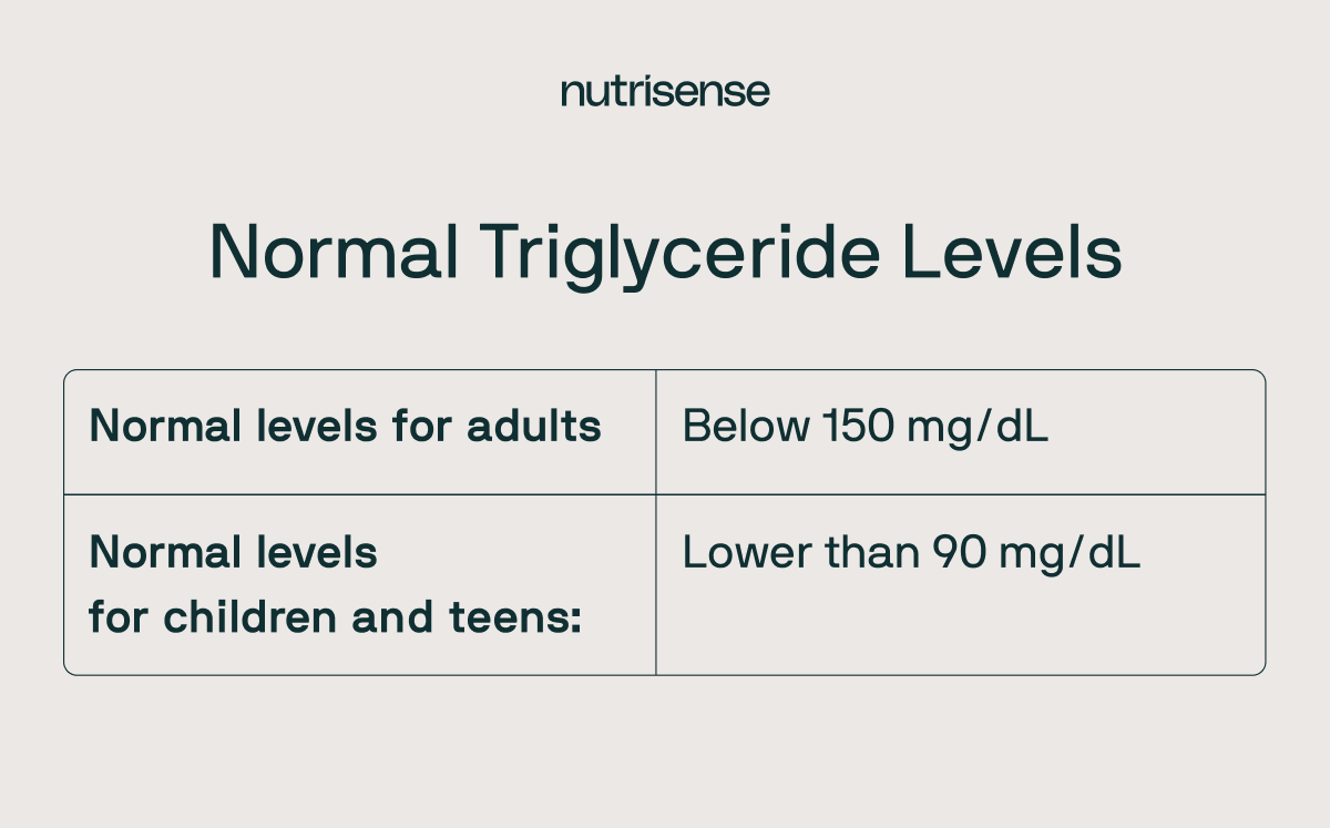 A normal triglyceride level for adults is considered to be less than 150 mg/dL. Having higher than normal triglycerides can increase the risk of heart disease and metabolic syndrome.