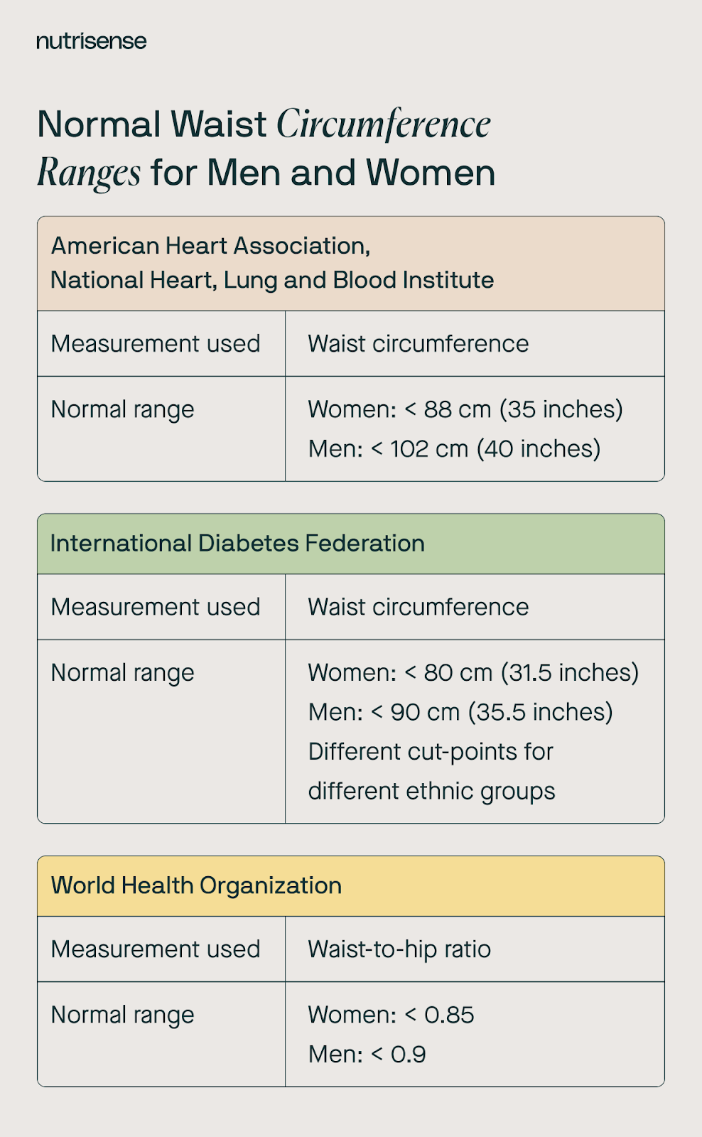A normal waist circumference is 35 inches for non-pregnant women and 40 inches for men. If your waist circumference is higher than this, you’re at risk.