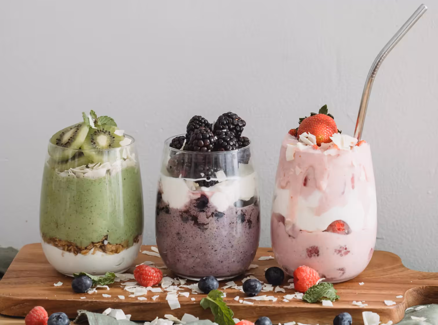 Breakfast parfait with a cup of plain Greek yogurt, 1â2 cup of blueberries, two tablespoons of walnuts, and one tablespoon of seeds such as chia, sunflower seeds, or flax seeds. Add an optional 1â4 teaspoon of cinnamon.