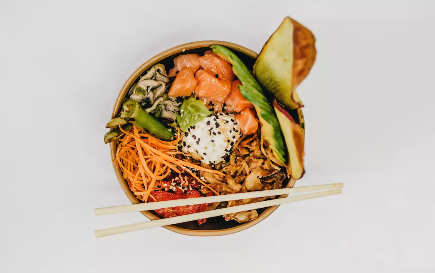 A salmon salad with four ounces of salmon (grilled, baked, or smoked), two cups of leafy greens, 1â4 cup of sliced cucumbers, seven cherry tomatoes, and a diced carrot. Add a Balsamic vinaigrette dressing made with olive oil, and eat it with a serving of almond crackers (our favorites are the ones from Simple Mills).