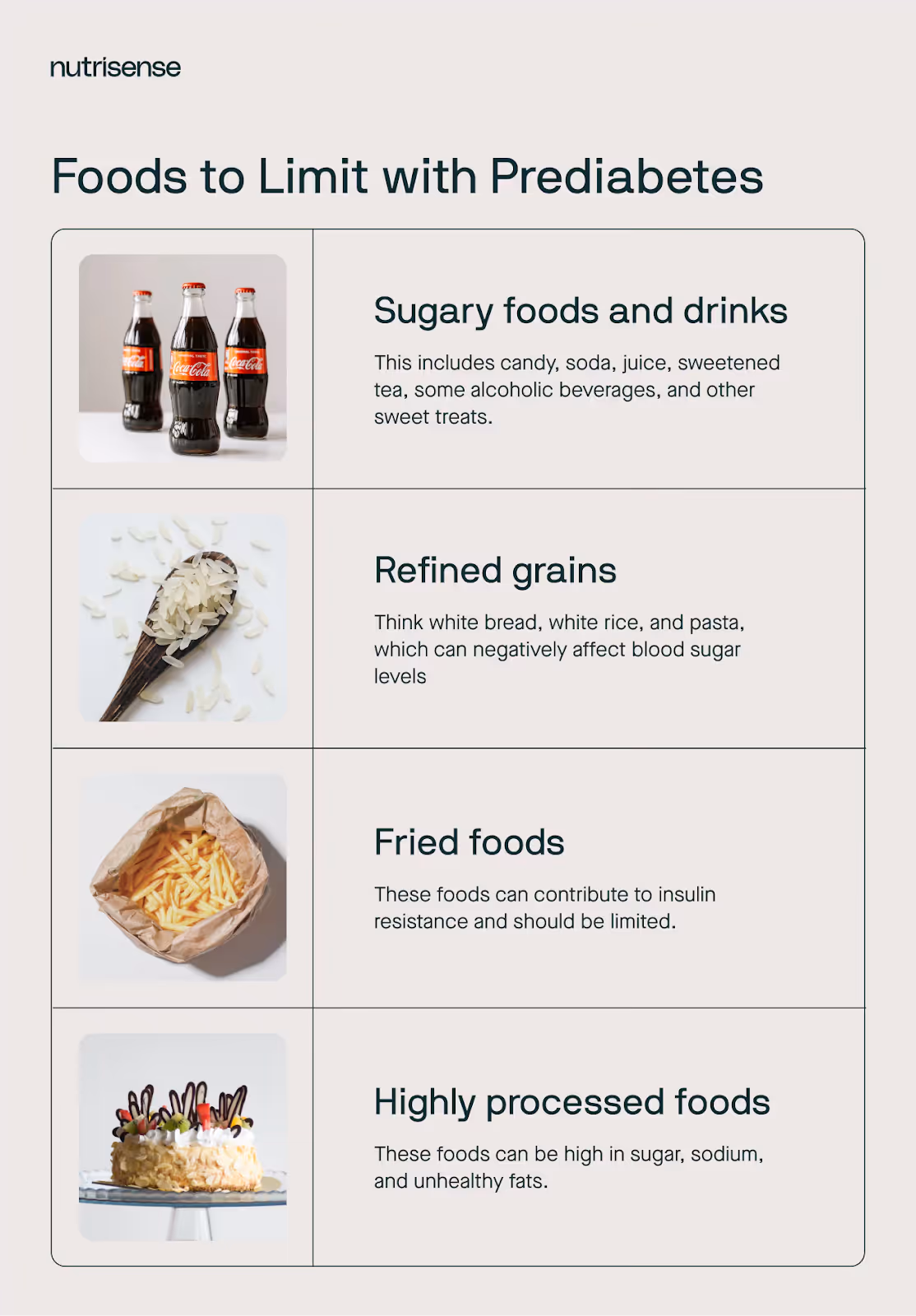 - Fried foods and foods high in saturated and trans fats: These foods can contribute to insulin resistance and should be limited. Choose healthy fats, such as those found in nuts, seeds, olive oil, fatty fish, and avocado.