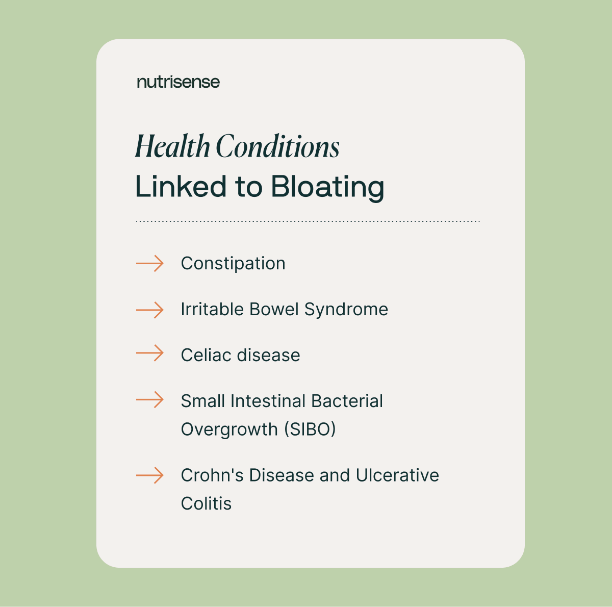 - Medical conditions like Irritable Bowel Syndrome (IBS), Celiac disease, and Small Intestinal Bacterial Overgrowth (SIBO) can also lead to chronic bloating.