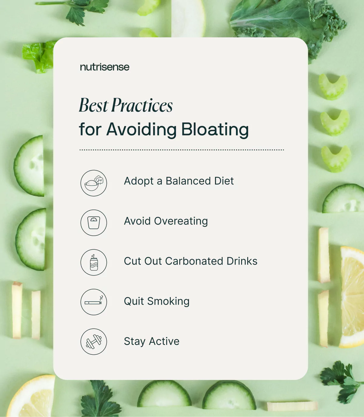 - Avoid Overeating: Try to eat until you're comfortably satisfied rather than overly full to avoid overeating, which may also cause a temporary, Â uncomfortable sensation of bloating.